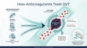 जैसे कि Heparin, Warfarin, या newer NOACs (Apixaban, Rivaroxaban)